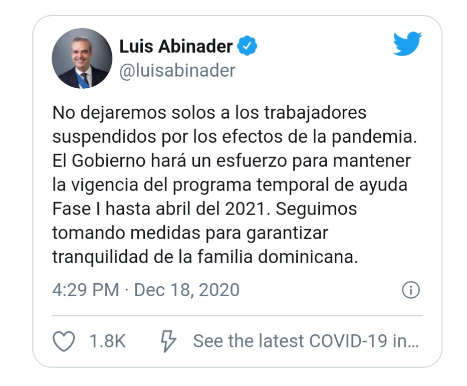El mandatario hizo el anuncio a través de su cuenta de Twitter @LuisAbinader. En su mensaje, dijo que su gestión “no dejará solos a los trabajadores suspendidos por los efectos de la pendemia”.