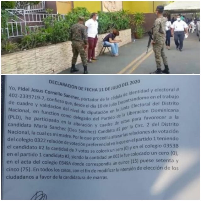 Fidel Cornelio, hijo de la diputada y candidata a la reelección, Cleo Sánchez, por el Partido de la Liberación Dominicana, fue apresado por miembros de la Policía Militar Electoral por supuestamente haber alterado las actas de mesas de votación con un bolígrafo en la Junta Electoral del Distrito Nacional para favorecer a su madre.