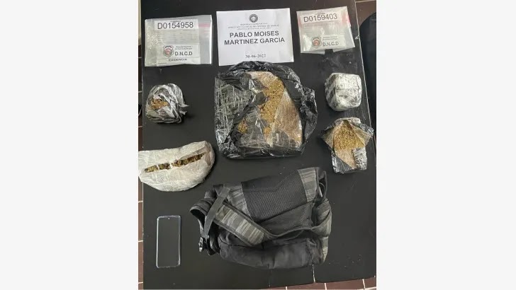 Según el informe, al ser requisado se le ocupó en una mochila cinco paquetes de un vegetal, presumiblemente marihuana, distribuidos en pedazos de funda plástica de color negro con rayas transparente y cinta adhesiva, con un peso aproximado de 15.0 Libras.