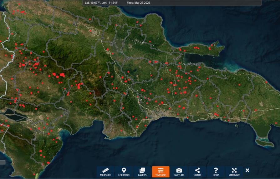 Mapa satelital de la NASA muestra la gran cantidad de fuegos forestales activos en el país.SANTO DOMINGO: En momentos en que imágenes satelitales aún muestran múltiples puntos de calor en la República Dominicana, el Ministerio de Medio Ambiente informó que persigue a los responsables de los incendios forestales que han impactado varias áreas del país, incluida las protegidas. La Administración Nacional de Aeronáutica y el Espacio de Estados Unidos (NASA) desarrolló el Sistema de Información sobre Incendios (FIRMS, por sus siglas en inglés), que muestra datos de incendios activos casi en tiempo real y mediante el cual se pueden observar los siniestros que afectan el territorio nacional. Conforme a los puntos rojos en el mapa, este martes hay por lo menos 100.El viceministro de Recursos Forestales, José Elías González, manifestó en un comunicado que la entidad distribuyó varios equipos de agentes facultados para la captura de los responsables de crear “adrede” los incendios en diferentes localidades del país.De su lado, Gerónimo Abreu, encargado del Programa de Gestión y Manejo del Fuego, detalló que bomberos forestales se mantienen trabajando contra los siniestros en San José de las Matas; San Juan; Ocoa, Cotuí y Villa Altagracia.