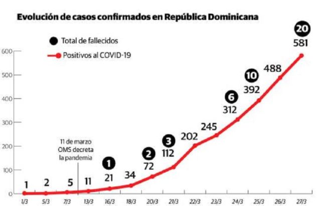 El Ministerio de Salud Pública informó que 20 personas han fallecido por coronavirus en República Dominicana, mientras que el número de casos confirmados aumentó a 581, según el reporte de este viernes 27 de marzo.