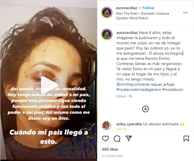 «Así quedé, no me mató de casualidad. Hoy tengo miedo de volver a mi país, porque esta persona sigue siendo funcionario público y con todo el poder a sus pies. Así mismo como me decía: soy un Dios», publicó Aurora Díaz en su cuenta de Instagram.