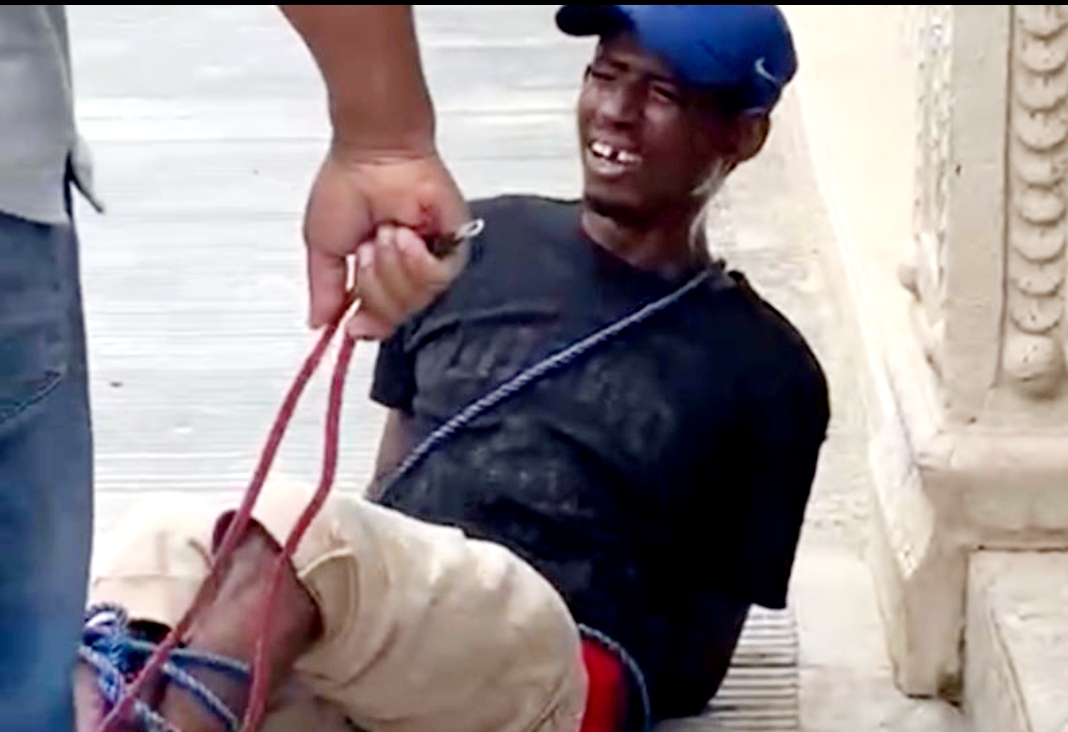 En el audiovisual se ve al supuesto delincuente tendido en el pavimento con las manos y los pies atados llorando e implorando por su vida, mientras el hombre al que se presume intentó robarle lo golpea a latigazos.
