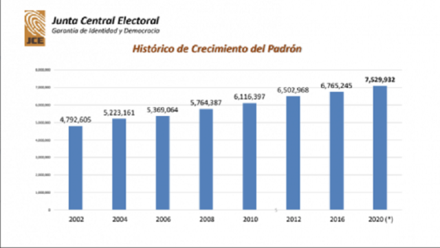 Sostuvo que el crecimiento del padrón entre 2016 y 2020 fue de un 10.66% equivalente a 721,816 nuevos electores. Desde 2008 hasta la fecha presentaba un crecimiento promedio de 6.3% cada dos años; sin embargo, del 2012 al 2016 solo tuvo un crecimiento aproximado un 4%, cuando debió ser de un 12.5%. Esta caída en el crecimiento se debió, dijo, al proceso de renovación de cédula que se inició en abril de 2014 y, en el cual quedaron pendientes por renovar 702,215.