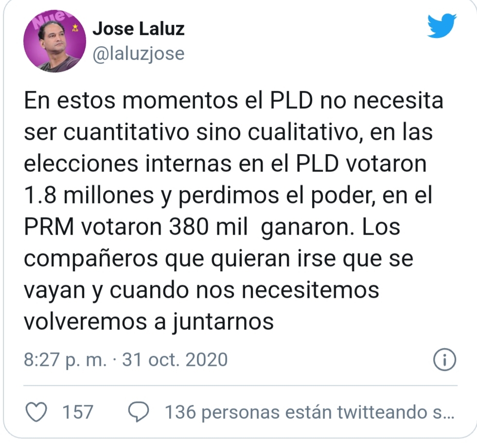 “En estos momentos el PLD no necesita ser cuantitativo sino cualitativo, en las elecciones internas en el PLD votaron 1.8 millones y perdimos el poder, en el PRM votaron 380 mil ganaron. Los compañeros que quieran irse que se vayan y cuando nos necesitemos volveremos a juntarnos”, dijo LaLuz en su cuenta de Twitter.