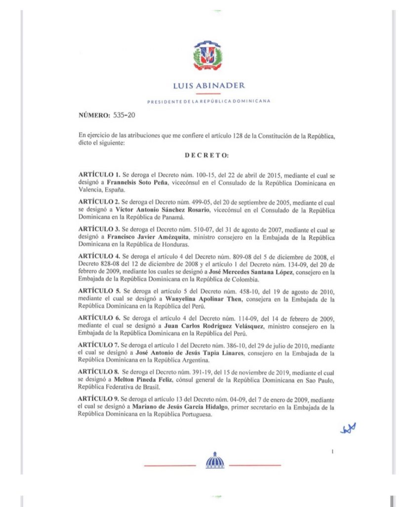 A través decreto No. 535-20, Abinader canceló a Pineda. También, el Jefe de Estado derogó a 45 más funcionarios, que estaban designados en el servicio exterior