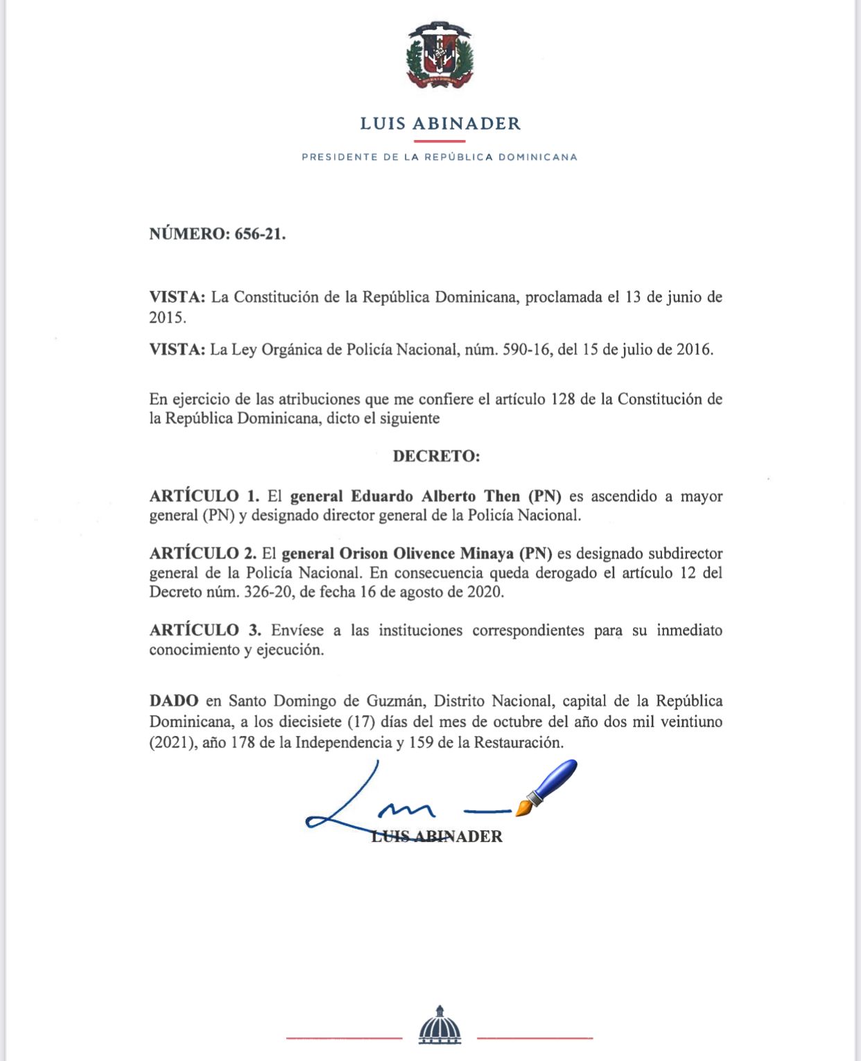 Con el mismo decreto 656-21 el mandatario nombró al general Orison Olivense Minaya como subdirector general de la Uniformada.