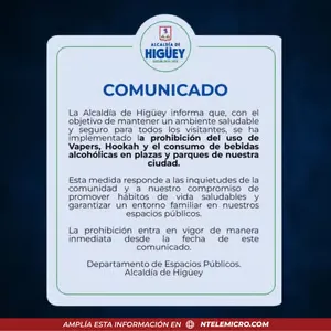 De acuerdo al comunicado, la prohibición entra en vigor de manera inmediata desde la fecha de este comunicado.La edil destacó que la medida responde a las inquietudes de la comunidad y al compromiso de la alcaldía de promover hábitos de vida saludable y garantizar un entorno familiar en los espacios públicos.