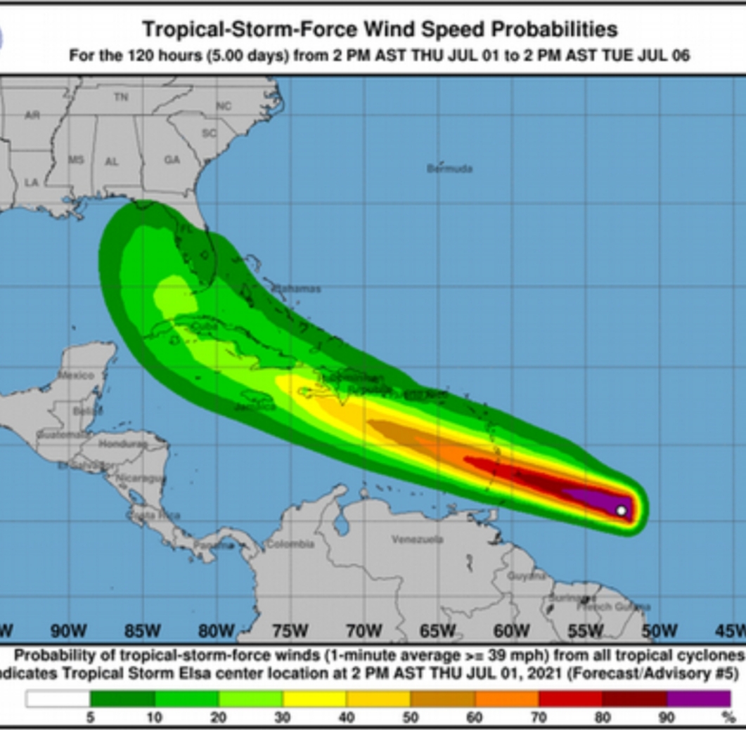 Según las proyecciones del NHC, Elsa pasará el viernes cerca o sobre porciones de las islas de Barlovento o por el sur de las islas de Sotavento (las meridionales de las Antillas Menores), para luego avanzar hacia el este del mar Caribe y el sábado situarse cerca de la costa sur de La Española (República Dominicana y Haití).