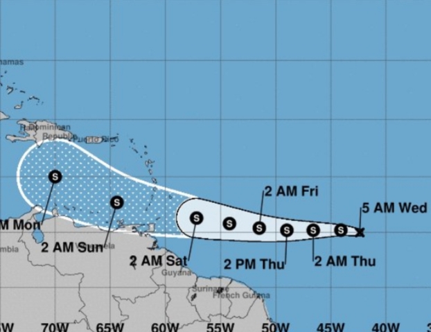 El centro del sistema estaba localizado a 1,905 kilómetros (1,185 millas) al oeste-suroeste de las islas africanas de Cabo Verde y a unos 2,285 kilómetros (1.420 millas) al este de las Islas de Barlovento del Sur, según un boletín del NHC, con sede en Miami.