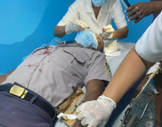 Señala que el agente junto a otros uniformados acudió a los llamados de auxilios que hacía el señor Ruperto Cuevas quién evadía los machetazos que le lanzaba su hijo con intención de matarlo.Fue en ese momento que los uniformados se abalanzaron sobre el agresor para apresarlo, quien antes de ser sometido ocasionó dos heridas al agente.El agente en cuestión resultó con heridas en la región frontal derecha y la mano izquierda, según diagnóstico médico expedido en el centro de salud enriquillense donde recibió los primeros auxilios.