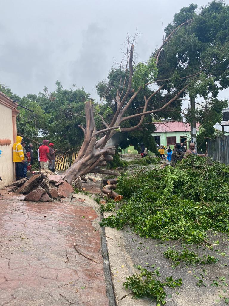 GALVAN, Bahoruco. Un árbol que creció en una esquina de la vivienda de la Senadora Melania Salvador, en la calle 25 de Abril de este municipio fue derribado por los vientos de la depresión Grace, la tarde de este lunes.