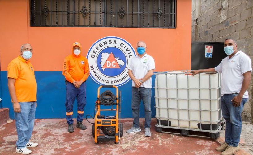 Villa Central, Barahona. Mayo 26, 2020. Como parte de la respuesta a la red de apoyo en el país, el Consorcio Azucarero Central (CAC) entregó a la Defensa Civil de Barahona una máquina de desinfección a presión de agua, así como dos tinacos con capacidad de 264 galones cada uno.