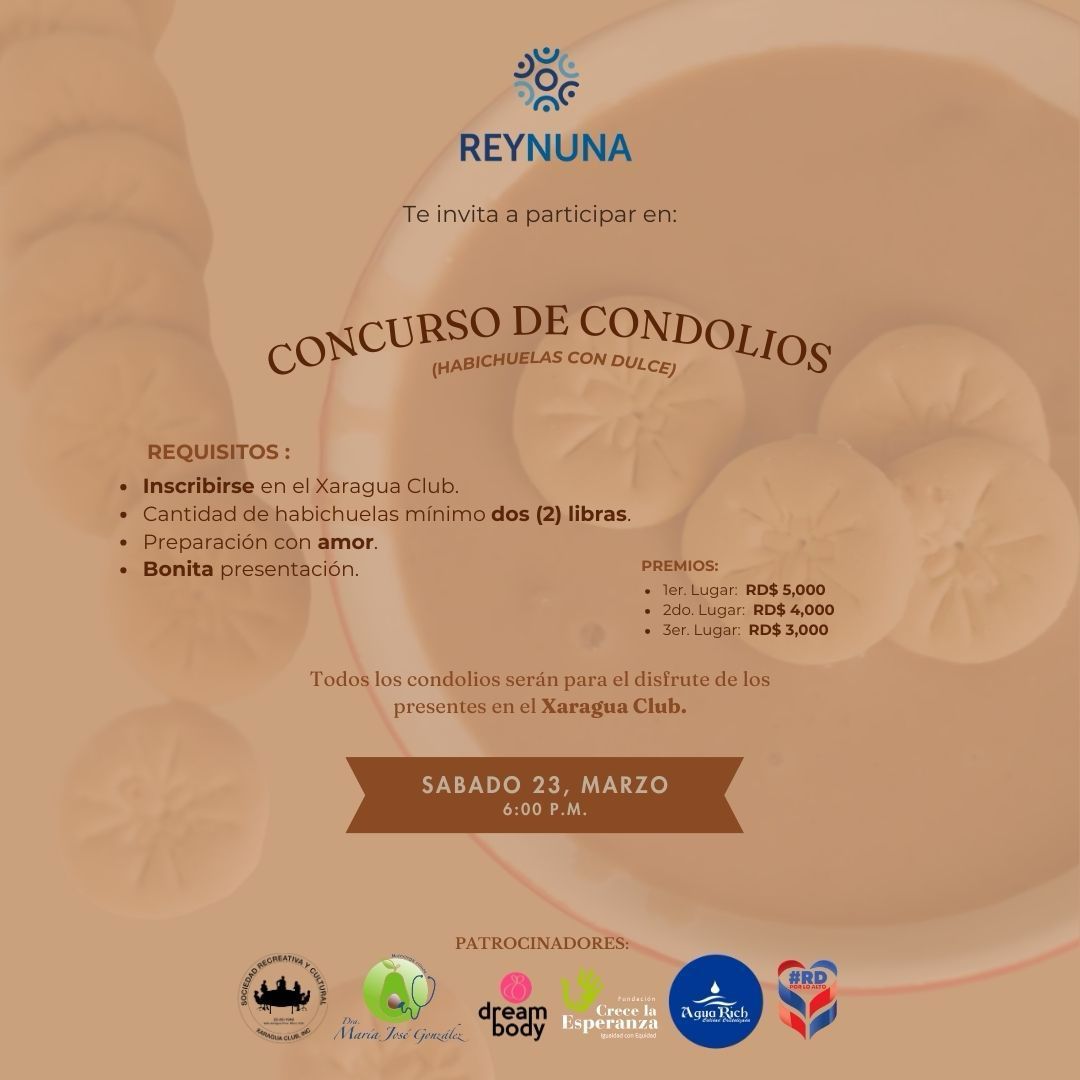 Por: Ozema Méndez Villa Jaragua – La Fundación Reynuna tiene el agrado de invitar a la comunidad a participar en el concurso de Habichuelas con Dulce, (Condoleos), que se llevará a cabo el sábado 23 de marzo en el Xaragua Club.