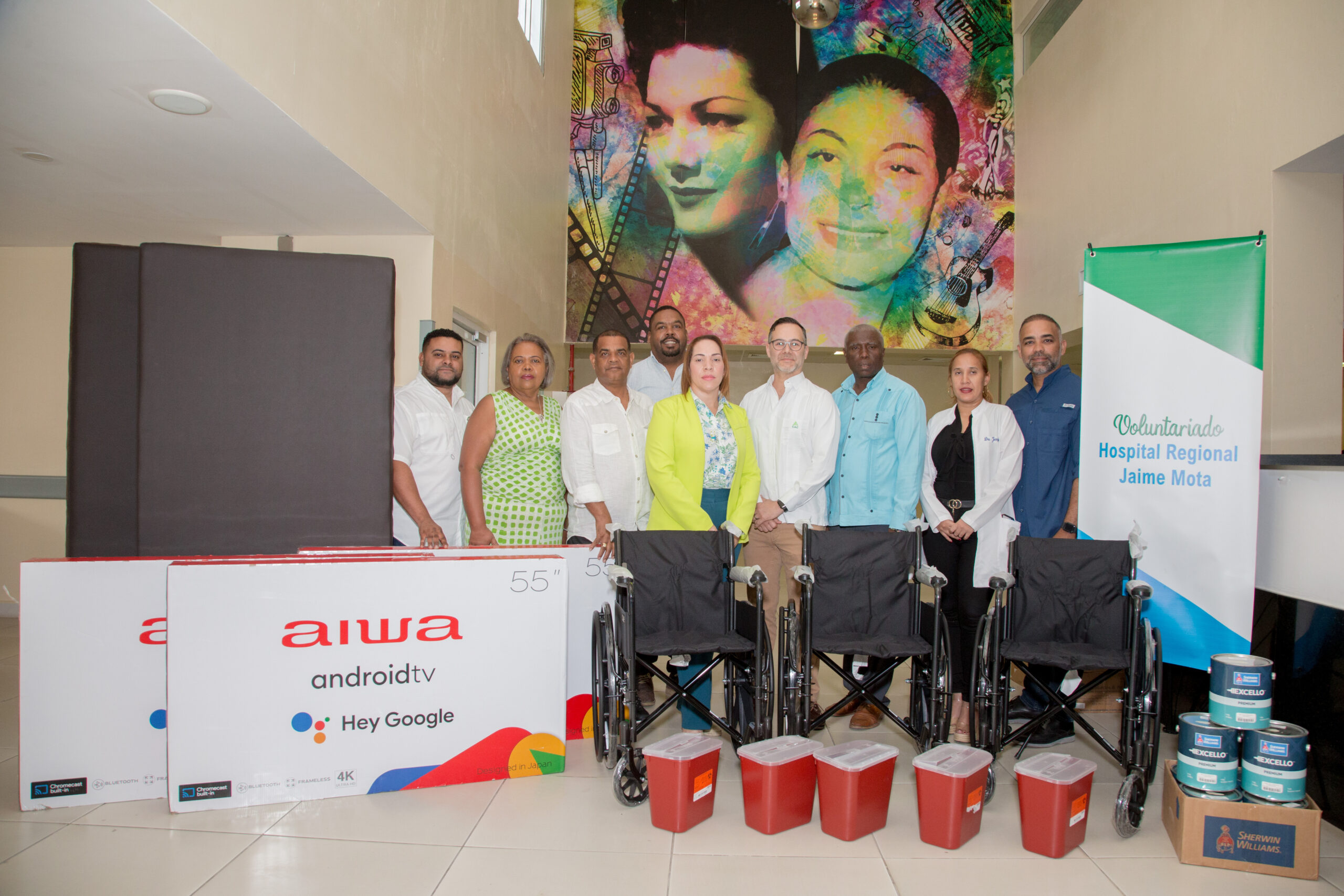 El Voluntario del Hospital Regional Jaime Mota entregó 5 sillas de rueda mecánicas plegables, 10 colchones para camas de recuperación, 30 latas de pintura sin olor, 3 televisores de 55 pulgadas y 5 zafacones para desechos biodegradables, gestionados a través de la primera dama, Raquel Arbaje, y el Ministerio de Industria, Comercio y Mipymes, como un esfuerzo conjunto para continuar aportando a que los ciudadanos de esta región Sur reciban servicios médicos de calidad.El acto de entrega de estos artículos fue realizado en el lobby del referido hospital, donde participaron José Antonio García, director de la Fundación Central Barahona (FCB); Mictor Fernández, alcalde del municipio Santa Cruz de Barahona; doctora Maria Batista, directora del Hospital Regional Jaime Mota; Wilkin Feliz, director regional del Servicio Nacional de Salud (SNS); Harlin Saldaña, gerente general de Grupo Everest, entre otras autoridades y personalidades.