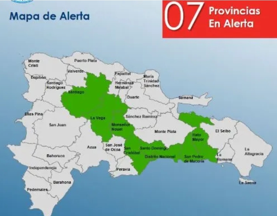 Las provincias en alerta son: Santiago, La Vega, Monseñor Nouel, San Cristóbal, Hato Mayor, San Pedro de Macorís y el Gran Santo Domingo.